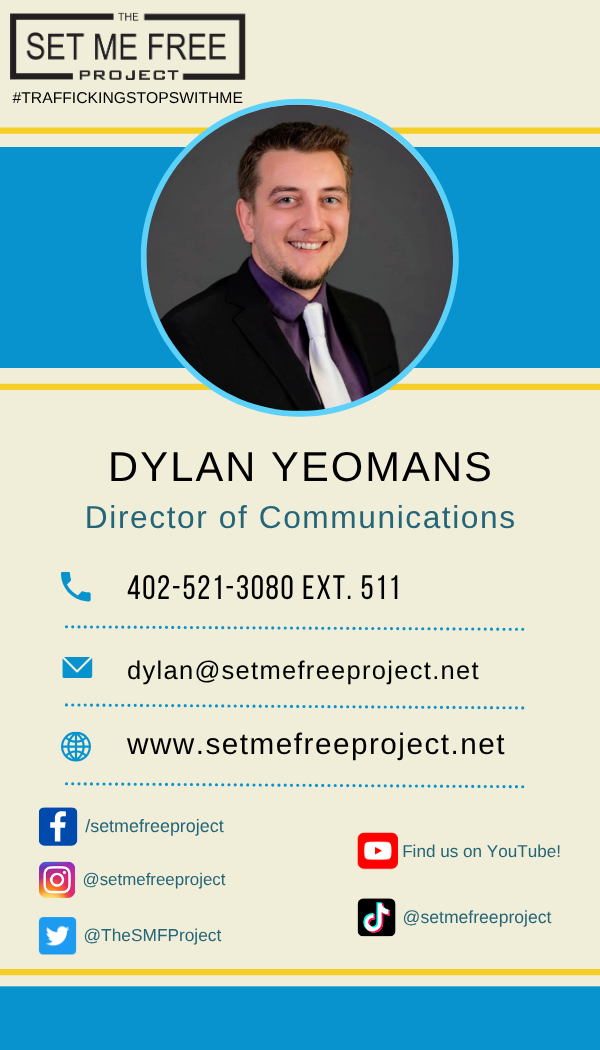 Dylan Yeomans serves as the Director of Communications for The Set Me Free Project, where he leads the organization’s messaging, media, storytelling, and public engagement efforts. In this role, Dylan helps amplify the mission of preventing human trafficking through education, ensuring that communities, partners, and supporters clearly understand both the urgency of the issue and the hope found in prevention.