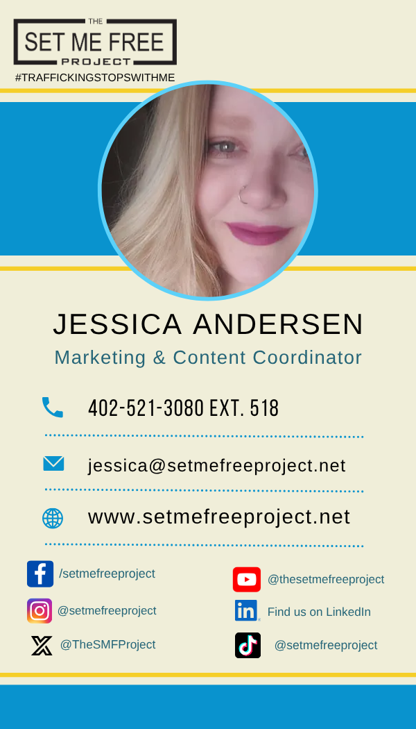 Today, as the Event, Marketing, and Content Coordinator, Jessica brings The Set Me Free Project’s mission to life through dynamic events, impactful marketing, and engaging content that amplifies the brand’s message and reach.