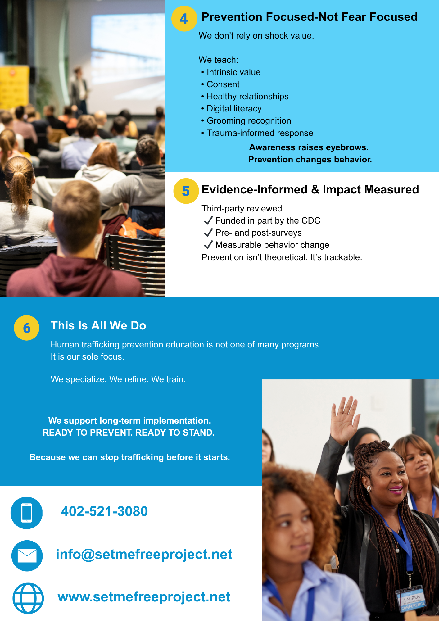 We create environments where participants feel emotionally and physically safe. No graphic content. No shock tactics. No fear-based messaging.