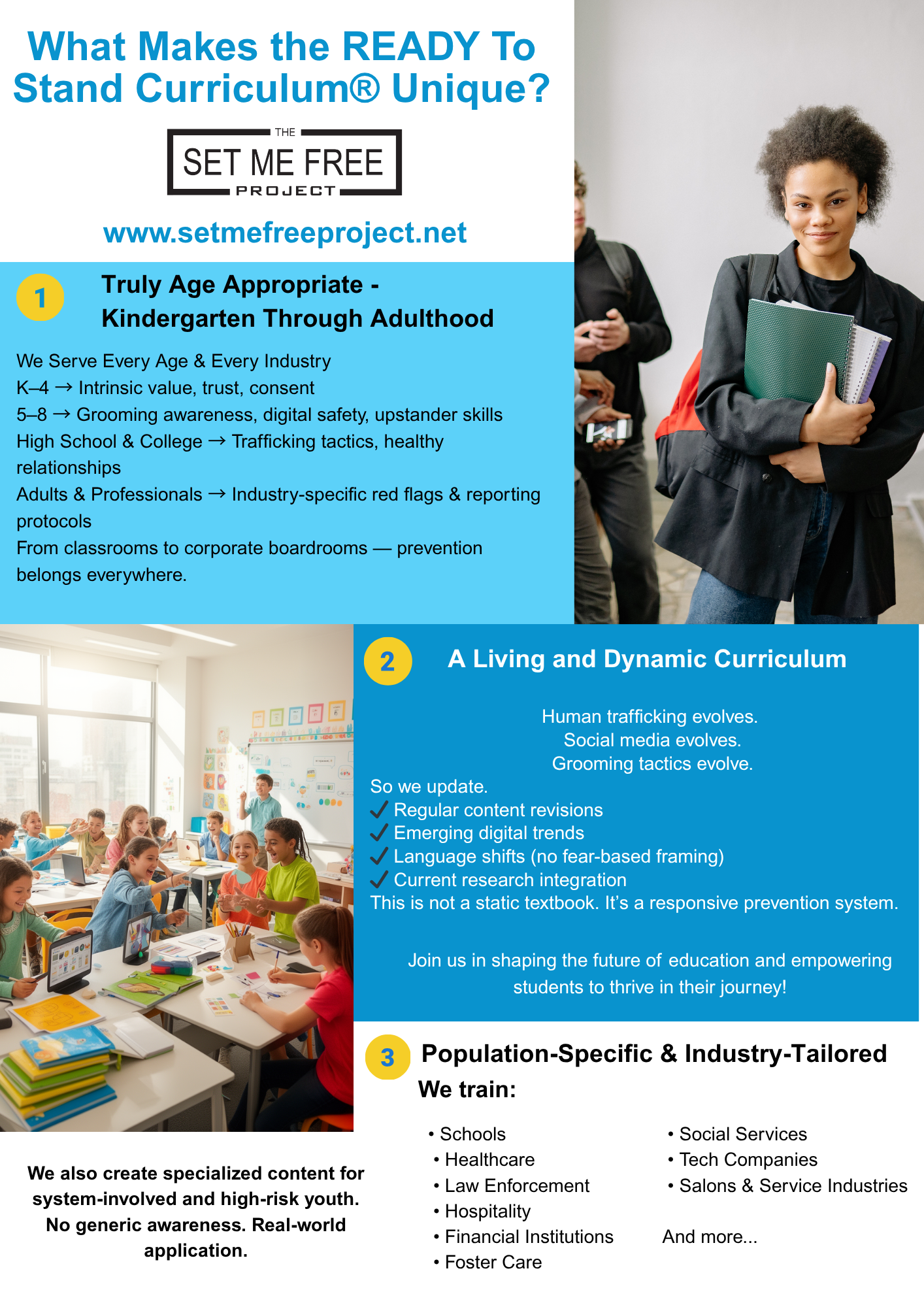 At The Set Me Free Project®, our curriculum is built on a foundation of research, lived experience, and best practices in prevention education.