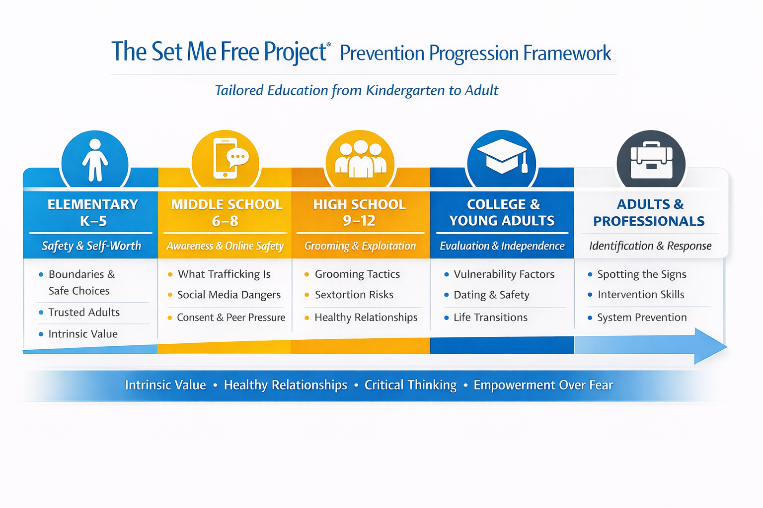 We use a trauma-informed, prevention-first approach that equips individuals with the tools to recognize, respond to, and prevent exploitation—at every stage of life.