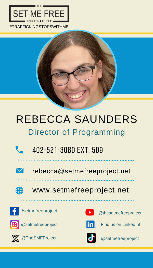 In 2023, she joined The Set Me Free Project as Director of Programming, where she leads the development and implementation of prevention education initiatives designed to equip youth, families, and professionals with the tools to recognize and prevent exploitation.