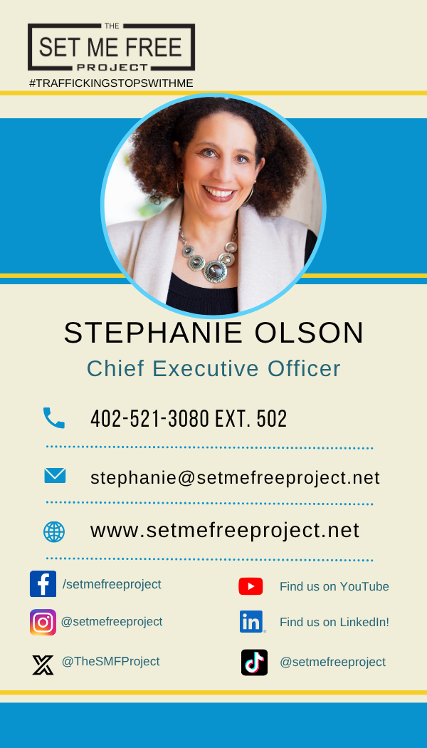 Before founding The Set Me Free Project ®, Stephanie worked with women in the area of sexual and domestic violence, addiction, and homelessness. She also worked with youth, teaching healthy relationships. After extensive training and research in the study of human trafficking prevention education and social media safety, she co-founded The Set Me Free Project.